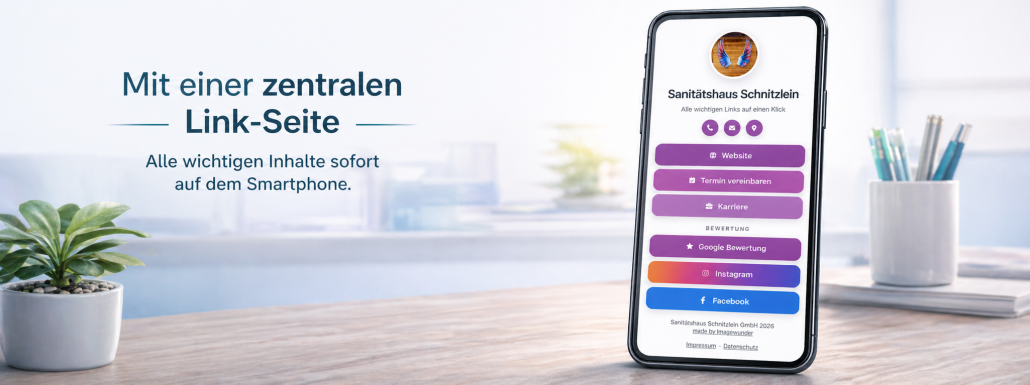 Eine zentrale Link-Seite erweitert Ihre bestehende Online-Präsenz um eine klare, strukturierte und vielseitig einsetzbare Lösung. Sie sorgt für mehr Übersicht, eine bessere Nutzerführung und macht es Ihren Kunden deutlich einfacher, mit Ihnen in Kontakt zu treten – insbesondere auf dem Smartphone, das heute der wichtigste Zugangspunkt ist.